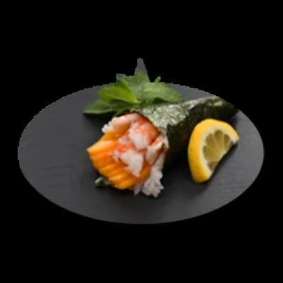 8 pièces - scampi frits, concombres enroulés de crevettes, saumon et oignons frits | ||