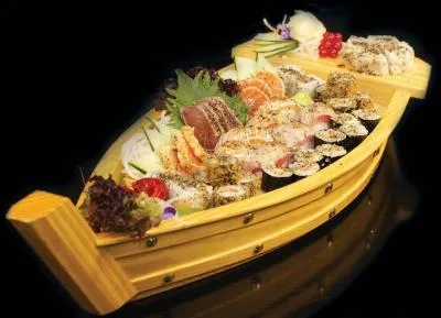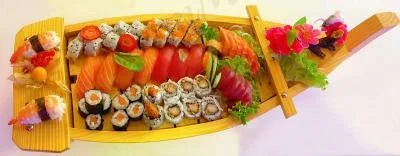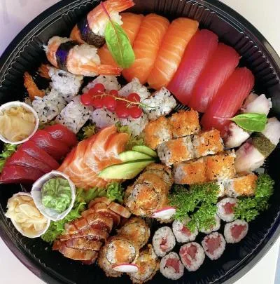 58 pièces - pour 2 personnes - 16pcs sashimi (saumon - thon - thon cuit), 8pcs hot rolls, 8pcs maki thon, 8pcs california saumon avocats, 8pcs california tempura scampi et 10pcs nigiri (saumon - thon - poulpe - crevettes) | ||